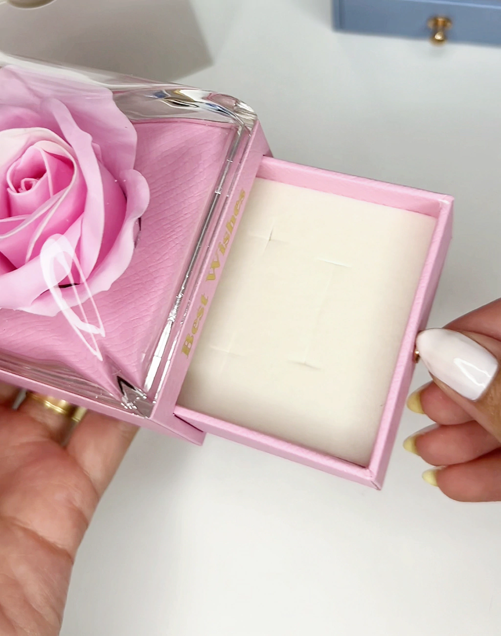 Caixa Porta joias é um charme! Com rosa dentro de uma campus tá onde você pode abrir e colocar um perfume!